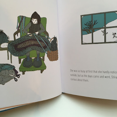 It's a children's story about a girl who doesn't like the cold; she knits warm things and has retreated somewhat from the world, but the story ends as she finds a way to brave the outdoors. It's a delicious book of knitty images, bonkers plans and thoughts about the cold that I can identify with. Knitters will undoubtedly love it, but as I don't knit myself, maybe it will appeal to anyone.